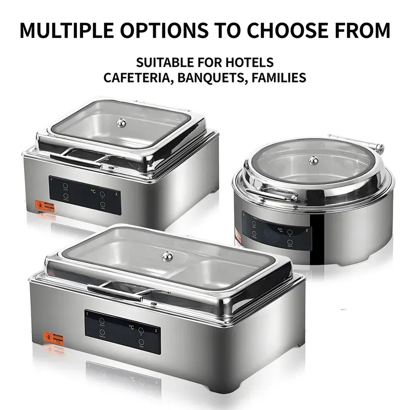 Billion Day custom round chafing dish features stainless steel, a precise CNC control panel, a clear glass lid, efficient heating, and a customizable design. Bulk orders welcome. Contact us to get high-quality buffet equipment solutions.