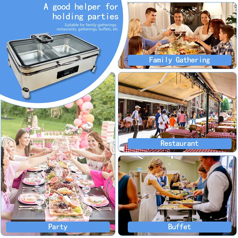 Upgrade buffet with our custom electric chafing dish buffet set, featuring premium 304 stainless steel, mirror finish, electric heating, and hydraulic glass lid, suitable for a variety of dining scenarios. Customization are avaliable, with competitive wholesale pricing. Contact us for a quote.