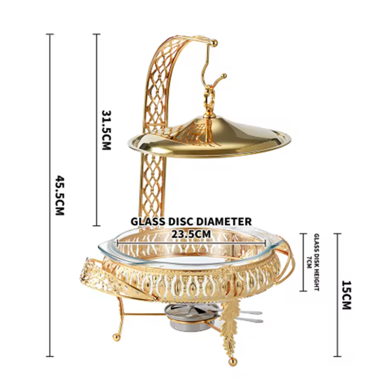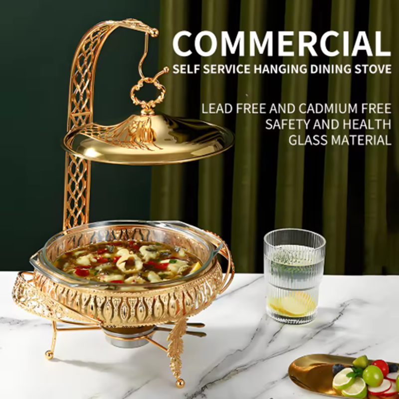 Wholesale buffet chafing dish combines gold retro openwork patterns and transparent glass lids, ideal for use in high-end banquets, buffets. Factory direct supply with controllable delivery times. Contact us for customized wholesale solutions!