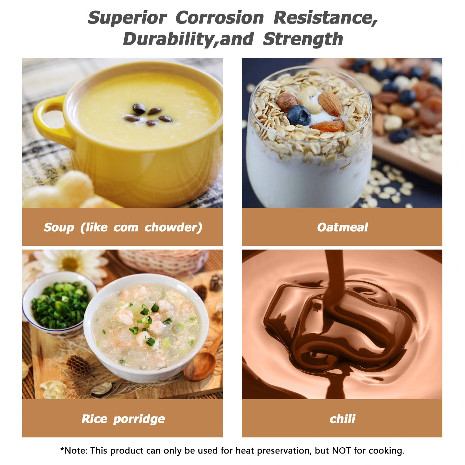 Compatible with a variety of soups: Including corn chowder, oatmeal, rice porridge, and chili soup, it’s especially suitable for keeping soups and stews warm.