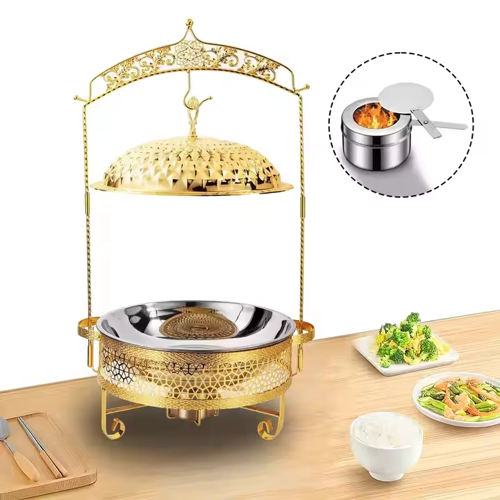 Stand-up chafing dishes are mobile vertical buffet warmers designed for commercial kitchen use. Models with electric heating or with heating using alcohol gel combined with water bath technology keep food within the safe temperature range of 60–85°C for 2 to 4 hours. Its transparent glass lid combines heat retention and presentation, letting diners see food while keeping it hot.